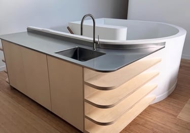 Conception, fabrication et pose de plans inox, avec options cuve intégrée, dosseret.